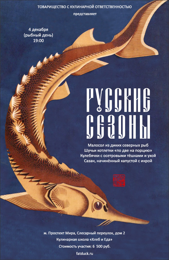 Мы продолжаем знакомить с лучшими блюдами великой русской кухни. В этот раз будем готовить русские рыбные блюда, к сожалению, ныне отчасти забытые. С опорой на многовековой опыт русской кухни и сегодняшние кулинарные знания. Современный взгляд на русскую кухню. Со всей кулинарной ответственностью и уважением к прошлому, настоящему и будущему. Приходите непременно, 4-го декабря (четверг). Вернём исконные блюда в наш посконный рацион!