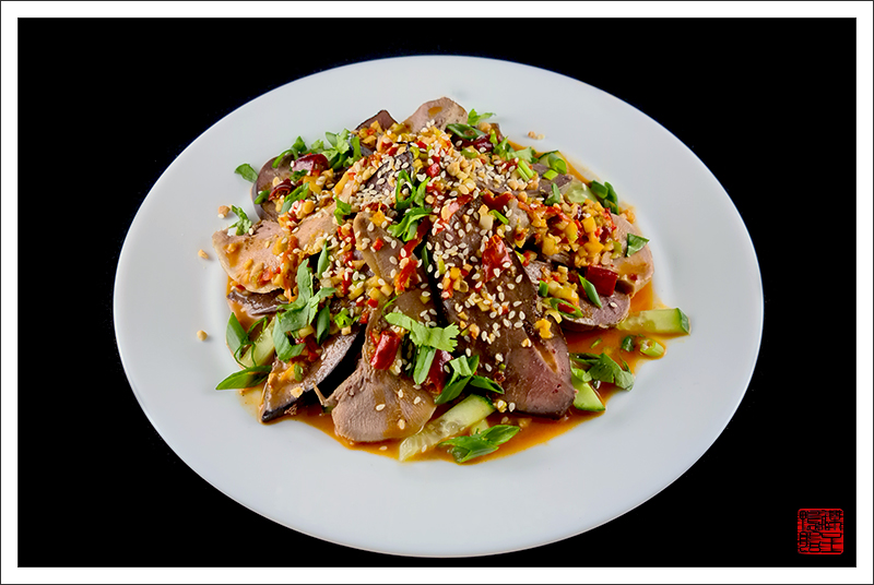 — Китайские фуци фэйпянь. Блюдо из осердия молодых барашков с легендарным сычуаньским соусом, обладающим дважды острым вкусом: из ароматного чили, сычуаньского перца и кунжута.