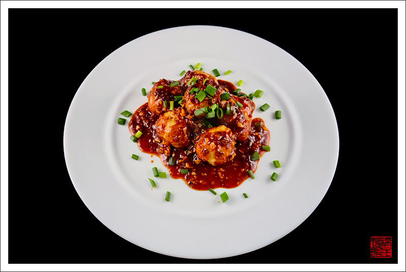 — Корейские омук в соусе бульдак. Котлетки, приготовленные из рыбы, креветок и кальмаров; обжаренные до хрустящей корочки и поданные под обжигающе-бодрящим соусом.