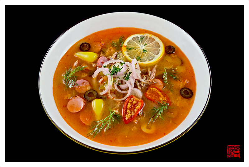 — Русская солянка «Жар-птица». Традиционная сборная солянка в огненном исполнении. Сваренная на крепком бульоне из птиц дворовых и поданная со всеми причитающимися случаю духоподъёмными штуками.