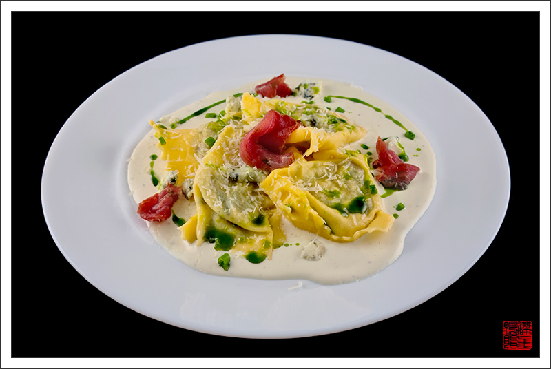 — Равиоли с томлёной уткой и соусом с горгонзолой.