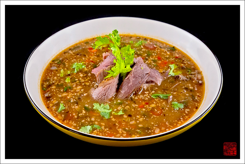 — Суп-харчо по-имеретински из гуся с кислым лавашом.