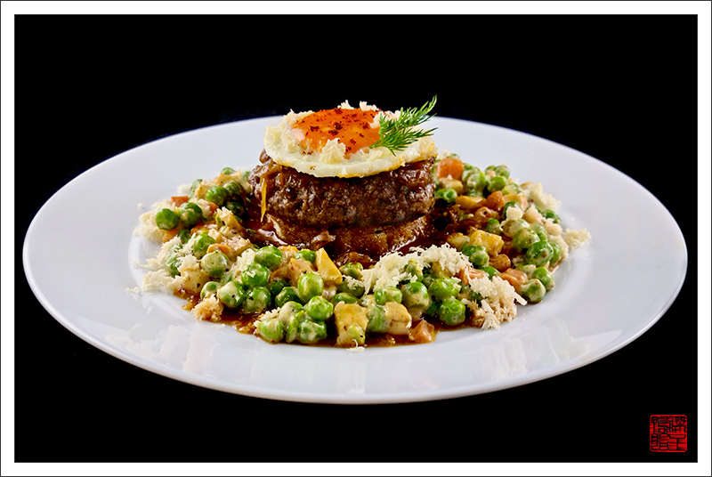 — Бифштекс рубленый с яйцом, соусом мадера и горошком.