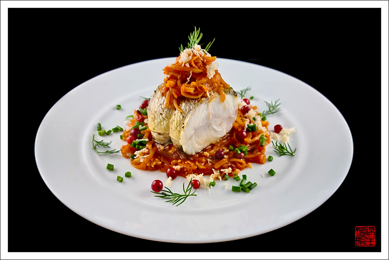 — Руло из судака под маринадом из белых кореньев.