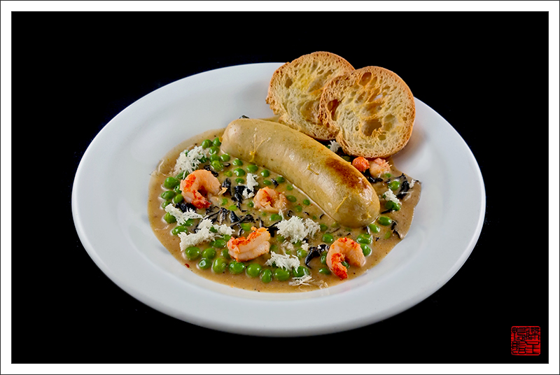 — Сосиски из воловьих мозгов и раков, со свежим вылущенным горошком, «очень вкусным соусом» с чёрными лисичками и поджаренною булкою.